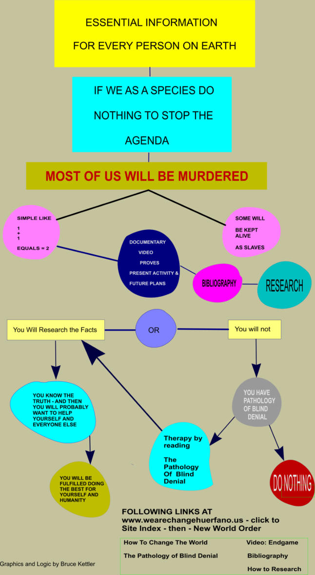 David RockefellerWe are on the verge of a global transformation. All we need is the right major crisis and the nations will accept the New World Order. Bertrand Russell quote: Gradually, by selective breeding, the congenital differences between rulers and ruled will increase until they become almost different species. A revolt of the plebs would become as unthinkable as an organized insurrection of sheep against the practice of eating mutton.The Impact of Science on Society by Bertrand Russell Diet, injections, and injunctions will combine from a very early age, to produce the sort of character and the sort of beliefs that the authorities consider desirable. And any serious criticism of the powers that be will become psychologically impossible.Dr. Eric Pianka quote:And I actually think the world will be much better when there's only 10 or 20 percent of us left. Dr. Eric Pianka quote: China was able to turn the corner and become the leading world superpower because they have a police state and they are able to force people to stop reproducing.Feb. 17, 1950 in the Senate Foreign Relations CommitteeWe shall have world government whether or not you like it, by conquest or consent.James WarburgH.G. WellsThe New World Order - 1939Countless people will hate the New World Order, and will die protesting against it.Ted Turner, interview Audubon Magazine:A total world population of 250-300 million people, a 95 percent decline from present levels, would be ideal. Wired Magazine Bill JoyHumanaty could be completely enslaved by 2030. At worst, mass extermination of everyone, but the elite, would take place.